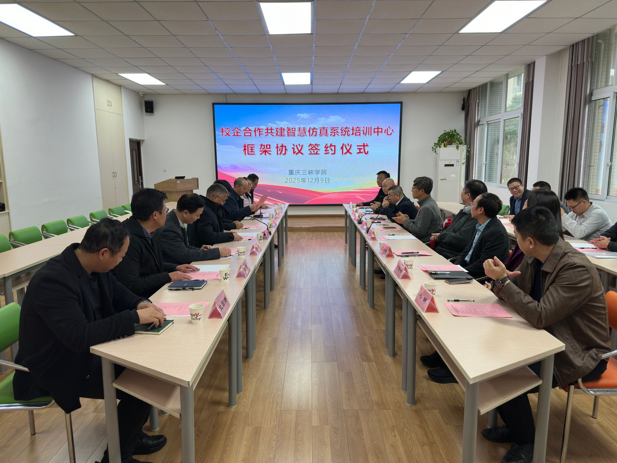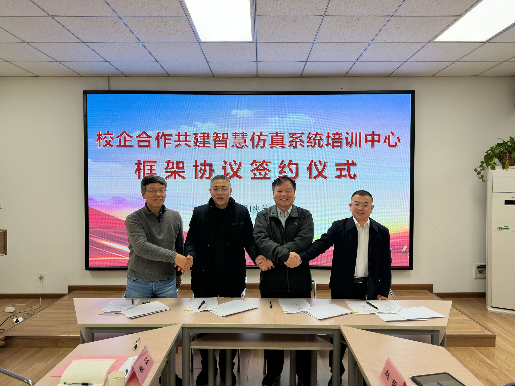 在与会人员的共同见证下,四方代表现场签署了合作框架协议并合影留念。根据协议,各方将围绕培训中心建设、课程开发、团队共建、技术研发与社会服务等方面开展深度合作,致力于打造一个技术先进、功能实用、运行高效的智慧仿真培训与研发平台。