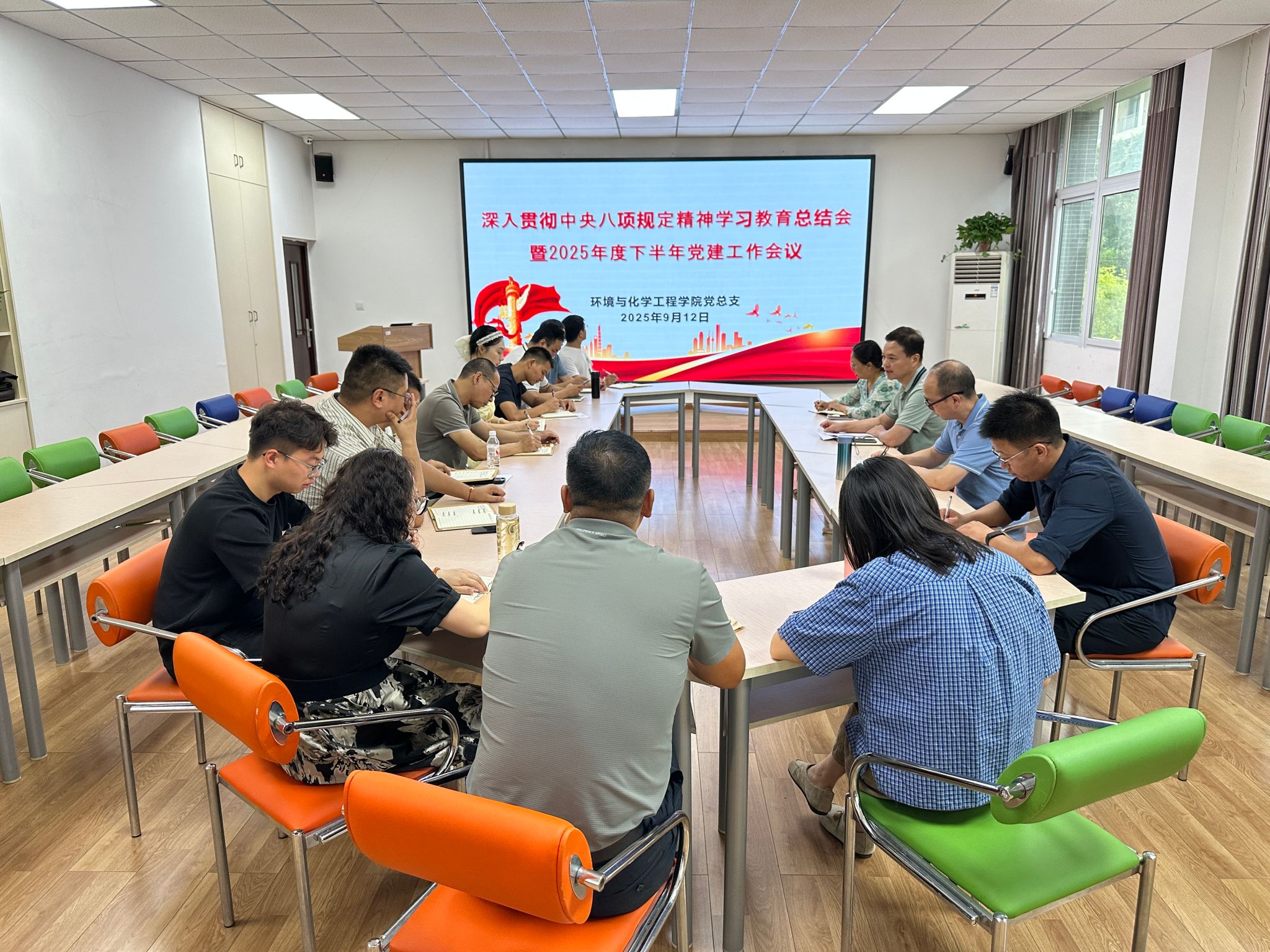 9月12日上午,公司党总支在慎思楼4-206会议室,召开“深入贯彻中央八项规定精神学习教育总结会暨2025年度下半年党建工作会议”。会议由党总支书记刘健主持,学院领导班子成员、党总支委员、各党支部书记及委员参加会议。